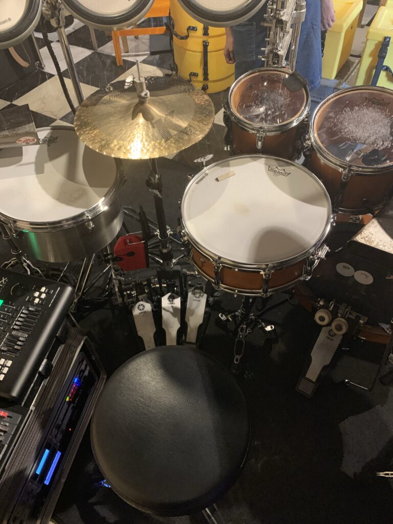 ペダルがめっちゃたくさんある。そしてビックリするくらいドラムスローン(ドラムの椅子)が高い。神保さん足長っつ!というセットでした。