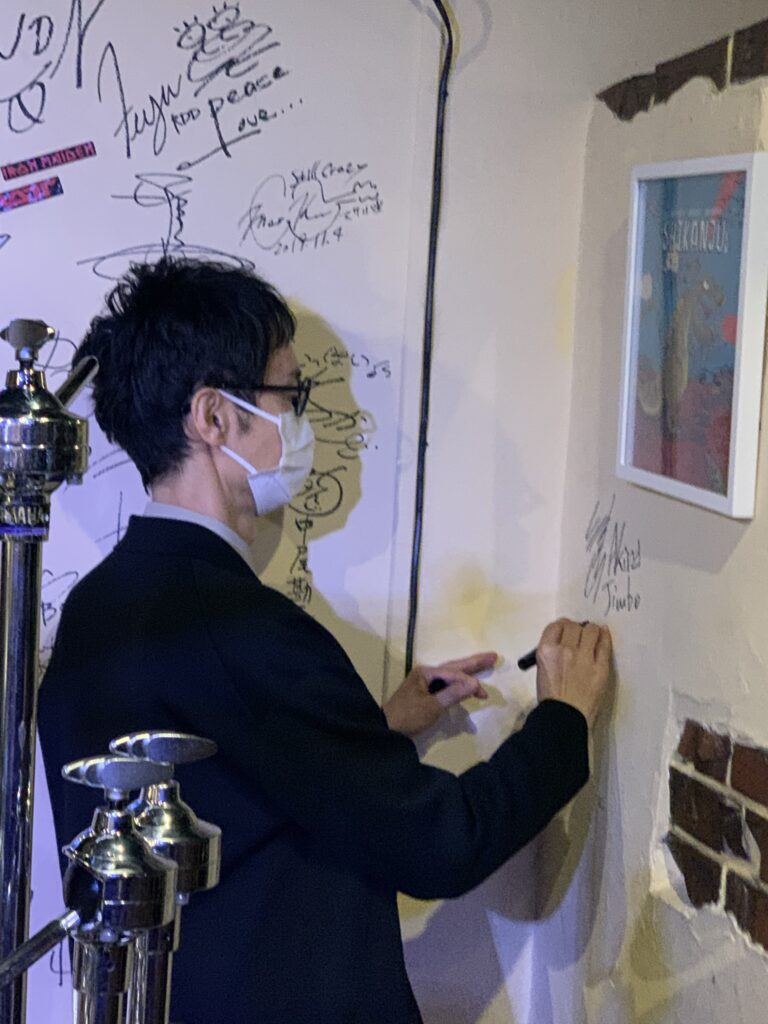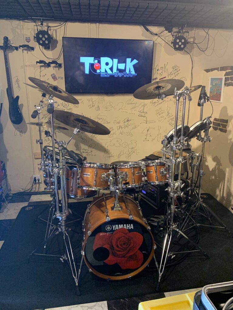 神保さんがサインを書いていらっしゃる、少し上に、これまたスーパードラマー「FUYU」のサインが見えるでしょ。このスペースはもう座るだけでドラムがうまくなるというスペースになりました。TORI-Kに来たら一度座ってみて下さい。