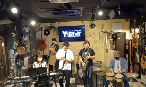 月に一度日曜日に開催している「ジャズセッション勉強会」略してジャズベン。そこに参加しているメンバーで今回集まれる人たちで、出演しています。「ジャズは敷居が高いし、難しそう。アドリブはよくわからないし途中で崩壊する。何をどうすればいいかちっともわからない」とジャズを避けていたメンバーですが、「素人でもわかるジャズ理論」でおなじみのSeki先生から、これこそ、もの凄いわかりやすさと、とてもやさしいスパルタ対応(ブルーノートスケールを覚えたらすぐセッションで実践。崩壊しようが、ネタ切れになろうが、同じフレーズの繰り返しになろうがとにかくアドリブをやらせるという教え方。そして耳が慣れた時に「カッコよくなる技法を少しづつ」教えてくれるスタイルで参加メンバーを導いてくれています。次回のジャズベンは5月29日日曜日。皆さんどうぞご参加ください。