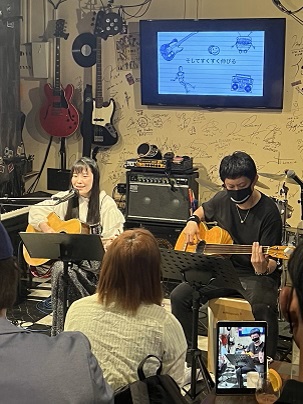 以前はドラム&エレキギターの爆音イケイケステージ。動きすぎがゆえにシールドが必ず外れて「バリっ!」という雷鳴をとどろかすパフォーマンス付きというステージスタイルでしたが、前回のホメノビライブからアコースティックギター&ボーカルという「魅せるスタイル」から「聴かせるスタイル」に変わったお二人。こちらの方がギターの音色、素敵な歌声がとてもよく聞こえて、お二人の良さがよく伝わっていると思うのですが、どうでしょうか。