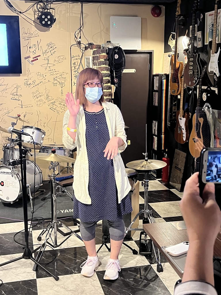 ホメノビライブに参加した感動をどうしても伝えたいということでライブの最後にステージでお話をされました。2年前のホメノビライブでも飛び入りでお話をされたのを覚えております。こんかいも手話を使って(手話通訳の勉強中だそうです)お礼の言葉を話されました。ホメノビライブはジャンルフリーですので是非エントリーして出演してみて下さいとお伝えしたところ前向きに考えられるそうで、次回はぜひ「青いうさぎ」を手話付きで演ってもらいたいですね。