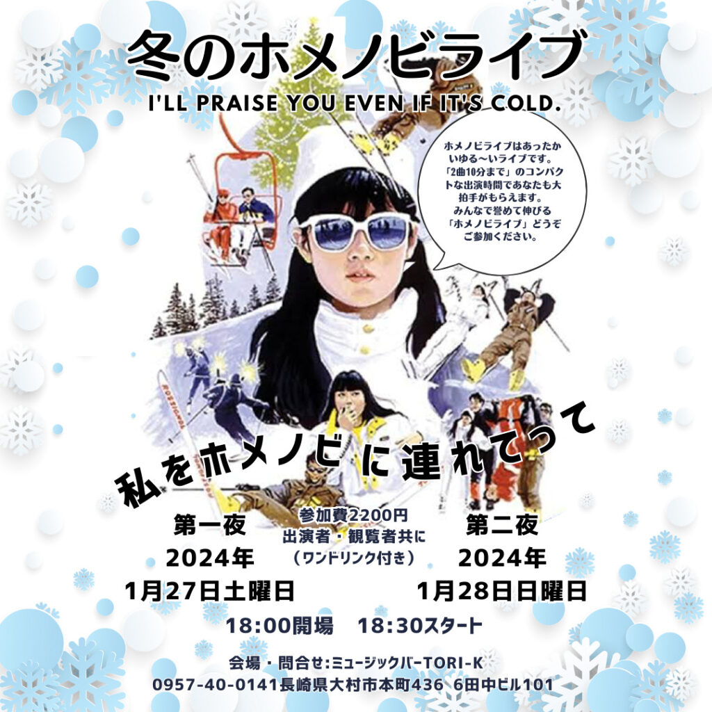 冬のホメノビライブ出演順決定しました!1月27日(第一夜)1月28日(第二夜)開催 冬のホメノビライブ~私をホメノビに連れてって~ の出演順が決まりました! お目当ての出演者の出番を狙って、おおほめまくりにご来場ください!